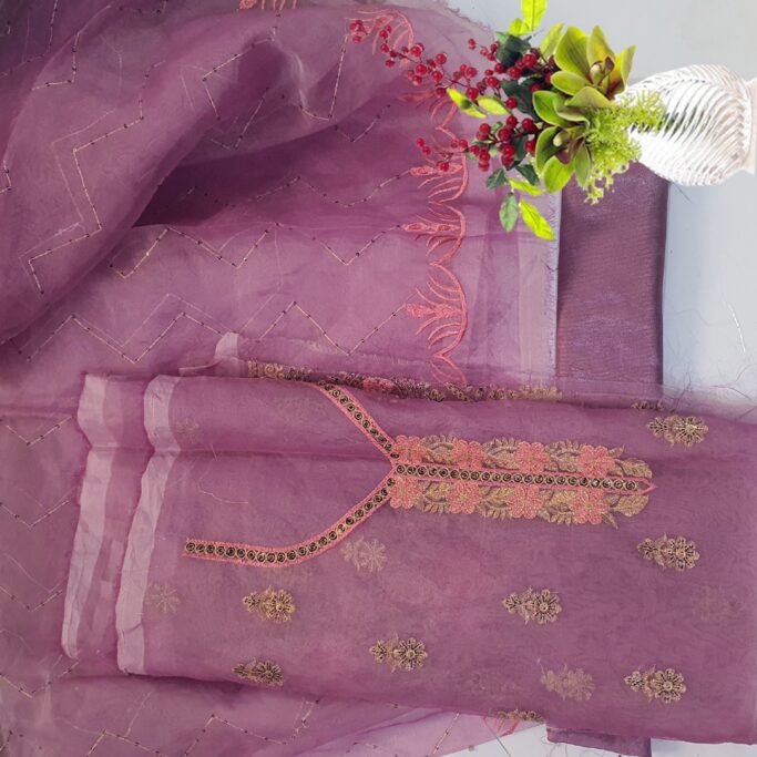 Fancy Embroidered Organza 3 Piece Unstitched Shirt & Trouser With Dupatta For Women